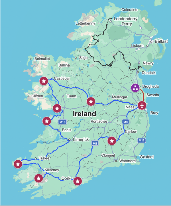 After immersing ourselves in Dublin’s history and culture, we’ll pick up a rental car and set off on a clockwise journey through the Republic of Ireland—saving Northern Ireland for another trip. Our route winds through a series of charming towns and pleasant landscapes, with two to three nights in each stop: Kilkenny, Monkstown (near Cork), Kenmare, Dingle, Doolin, Galway, Westport, and Athlone, before looping back to Dublin for our return flight home.