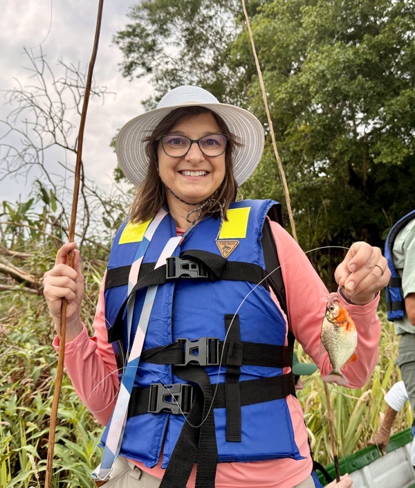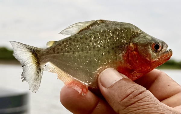I managed to hook several, but each wriggled free and flopped back into the water before I could haul them into the boat. Eventually, I gave up—it was actually more fun to watch the others. Everyone else caught and released at least one fish. Jane had particular success, catching three piranhas—two red and one white. They were the first fish she’d ever caught! She was laughing and clearly enjoying herself.