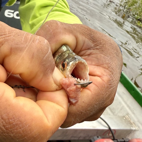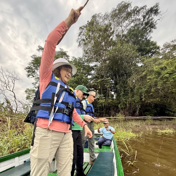 Shortly after breakfast, we boarded an open boat and headed upriver to try our hand at piranha fishing. Along the way, our captain spotted several freshwater pink dolphins surfacing across the river. We changed course to get a better view and spent about 45 minutes watching for them. The lighting was harsh, and the dolphins surfaced only briefly—much less visibly than the Atlantic dolphins we’re used to back home. It was hard to make out their pink coloring and nearly impossible to get a good photo.