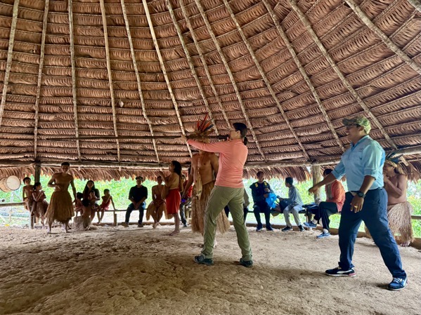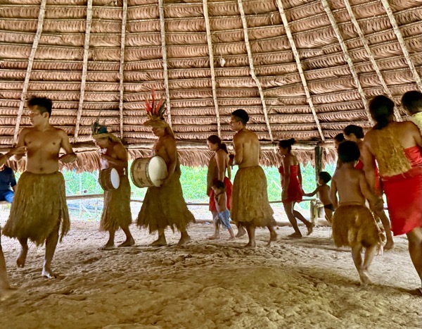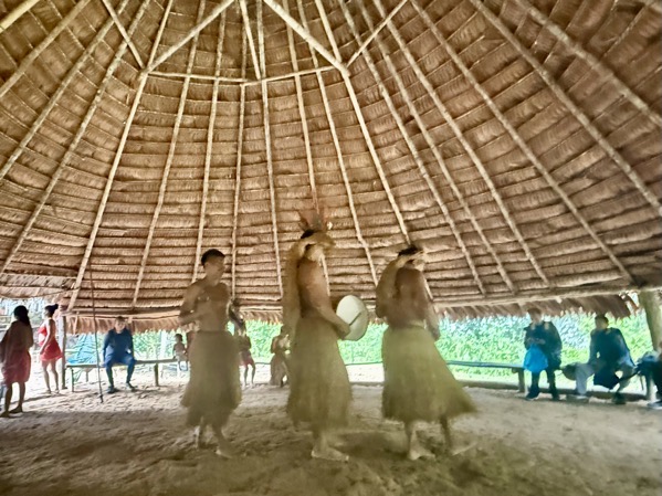 The Yagua people welcomed us into an open-sided building and performed a traditional dance, followed by another in which we visitors were invited to join. The performance was accompanied by drums and chants.