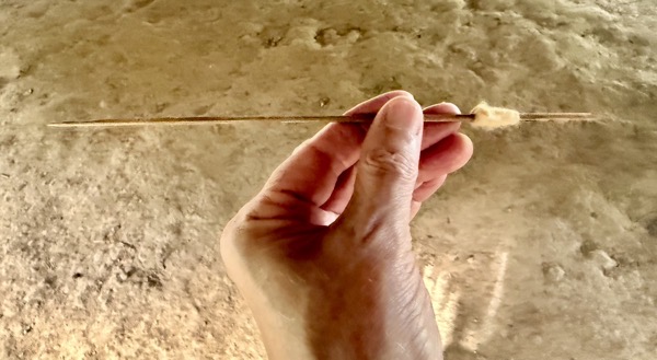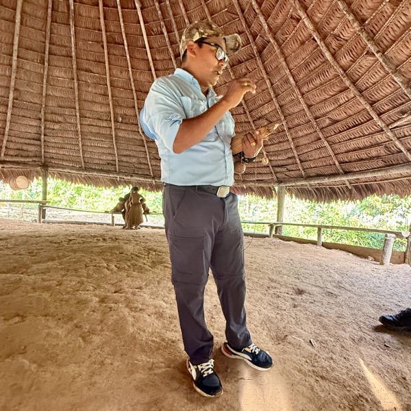 Next, we watched a man demonstrate how to use a blowgun to hit a target. Then it was our turn. Remarkably, I hit the target on my first try—and wisely decided not to tempt fate with a second attempt. Jane missed three times but was a good sport about it. German shared more fascinating details about Yagua hunting techniques, including how they prepare poison from native plants to coat their blowgun darts. He also explained that the darts are often sharpened using the razor-like teeth of piranhas, making them even more effective for hunting in the dense Amazon rainforest. Afterward, we wandered through the muddy outdoor craft stalls to browse handmade goods. Jane bought a small balsa wood carving of a capybara for 10 soles.