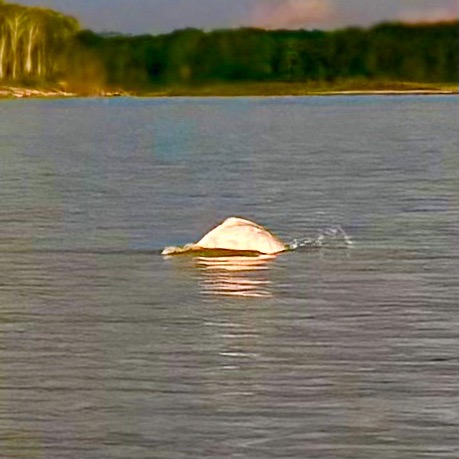 On the way back down the Amazon, the skies cleared and a vibrant rainbow arched overhead, tracing the river with color. Our guide spotted more pink dolphins, giving us a second chance to observe these elusive creatures as they surfaced and fed. This time, with better light and calmer water, we were able to more clearly see their distinctive pink coloration—though capturing them on camera was still a challenge. The captain cut the engine and let us drift quietly in a wide circle, giving us a better look without disturbing them. We watched in silence for about half an hour, enjoying their graceful, fleeting appearances before continuing back to the lodge.