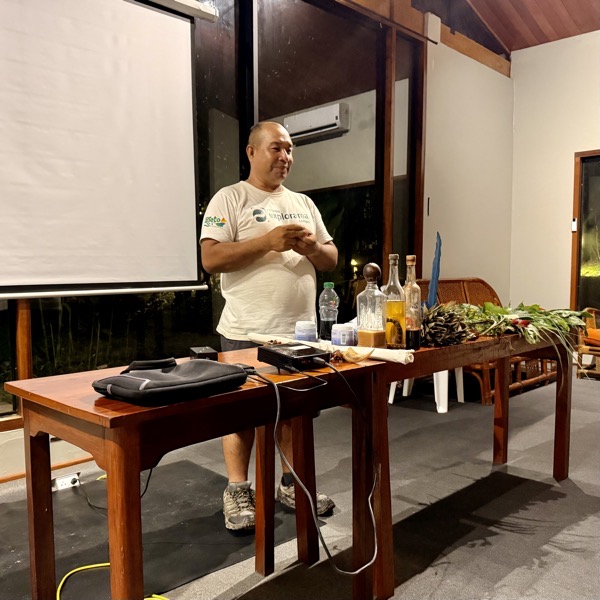 After another filling buffet dinner, German had arranged a special lecture and demonstration by a local shaman. He spoke about the many medicinal and hallucinogenic plants he uses to treat various ailments—plants that have been part of Amazonian healing traditions for generations. Following the talk, he led a spiritual ceremony intended to bestow good fortune and health upon us.