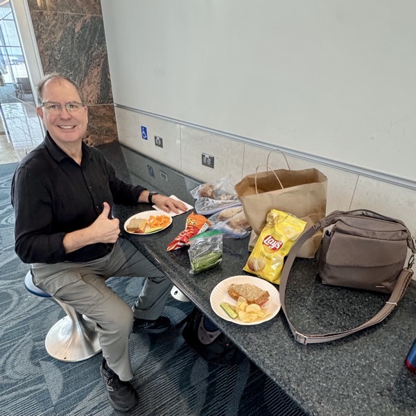 After a short flight to Atlanta, we made our way to the distant and sparsely crowded Terminal F, home to the international gates. Jane had packed tomato sandwiches and sides, so we just grabbed a bag of chips and enjoyed a homemade lunch at a workstation counter. With plenty of time to kill before our 3:35 p.m. flight (which was eventually delayed a bit), Jane took the opportunity to call her sister — and ended up chatting for nearly an hour.